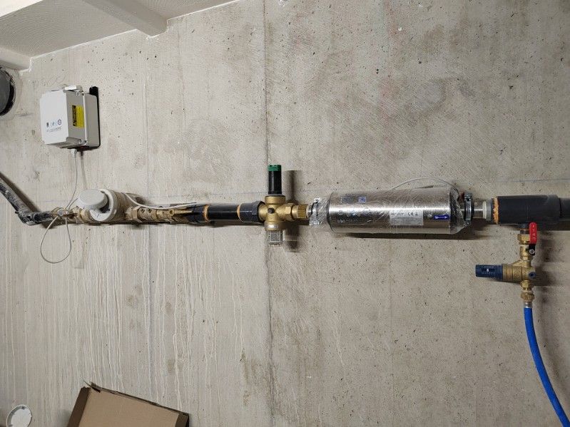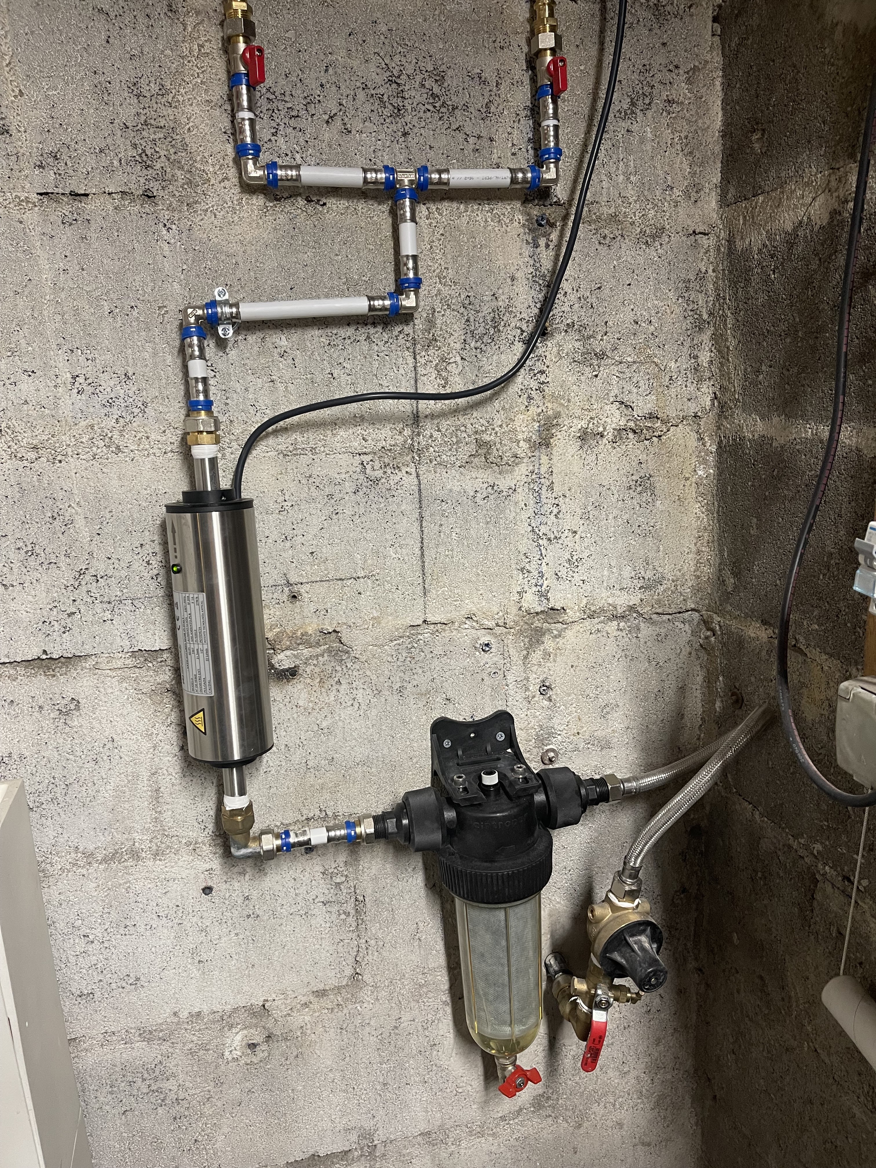 Pose de l'hydropure ce jour. Travail soigné du plombier. De très bon conseil de Mr FLORES. Pas de sel, pas d'eau gaspillée pour la régénération, pas d'entretien, pas de filtre en coton à changer. Autre avantage pour nous : un adoucisseur d'eau au sel fait augmenter la teneur en sel dans l'eau et par conséquence incompatible avec l'hypertension. D'autre part les cartouches à charbon pour la consommation d'eau potable diminue l'efficacité des médicaments. Y a plus qu'à voir à l'usage.
